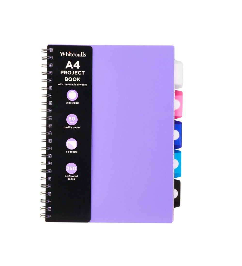 Description. Product Details. Delivery & Returns. Keep your project organised with this purple Whitcoulls A4 project book featuring 5 removable coloured tabs with pockets and 250 wide ruled, 80gsm perforated pages. $19.99. Add To Cart. $34.99. Add To Cart. $34.99.